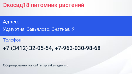 Экосад18, питомник растений по адресу Удмуртия, Завьялово, Знатная, 9 в дальнейшем Организация, размещена в следующих категориях:
