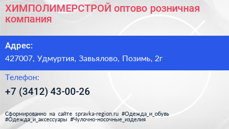 ХИМПОЛИМЕРСТРОЙ, оптово-розничная компания по адресу 427007, Удмуртия, Завьялово, Позимь, 2г в дальнейшем Организация, размещена в следующих категориях: