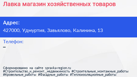 Лавка, магазин хозяйственных товаров по адресу 427000, Удмуртия, Завьялово, Калинина, 13 в дальнейшем Организация, размещена в следующих категориях: