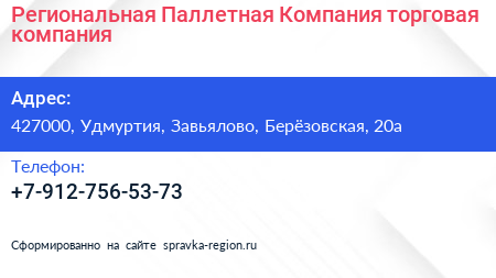 Региональная Паллетная Компания, торговая компания по адресу 427000, Удмуртия, Завьялово, Берёзовская, 20а в дальнейшем Организация, размещена в следующих категориях: