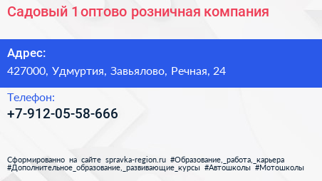 Садовый №1, оптово-розничная компания по адресу 427000, Удмуртия, Завьялово, Речная, 24 в дальнейшем Организация, размещена в следующих категориях: