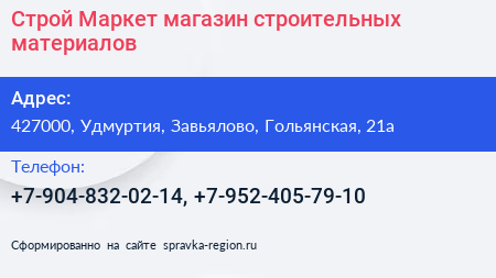 Строй Маркет, магазин строительных материалов по адресу 427000, Удмуртия, Завьялово, Гольянская, 21а в дальнейшем Организация, размещена в следующих категориях: