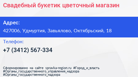 Свадебный букетик, цветочный магазин по адресу 427006, Удмуртия, Завьялово, Октябрьский, 18 в дальнейшем Организация, размещена в следующих категориях: