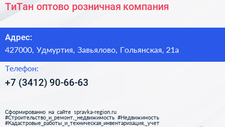 ТиТан, оптово-розничная компания по адресу 427000, Удмуртия, Завьялово, Гольянская, 21а в дальнейшем Организация, размещена в следующих категориях: