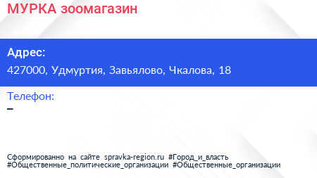 МУРКА, зоомагазин по адресу 427000, Удмуртия, Завьялово, Чкалова, 18 в дальнейшем Организация, размещена в следующих категориях: