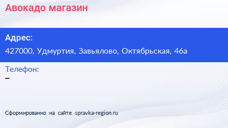 Авокадо, магазин по адресу 427000, Удмуртия, Завьялово, Октябрьская, 46а в дальнейшем Организация, размещена в следующих категориях: