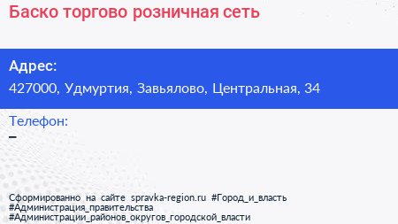 Баско, торгово-розничная сеть по адресу 427000, Удмуртия, Завьялово, Центральная, 34 в дальнейшем Организация, размещена в следующих категориях: