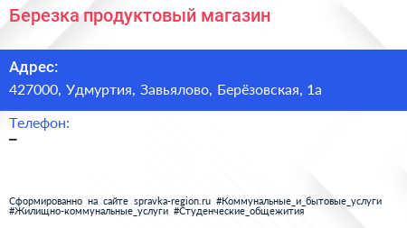 Березка, продуктовый магазин по адресу 427000, Удмуртия, Завьялово, Берёзовская, 1а в дальнейшем Организация, размещена в следующих категориях: