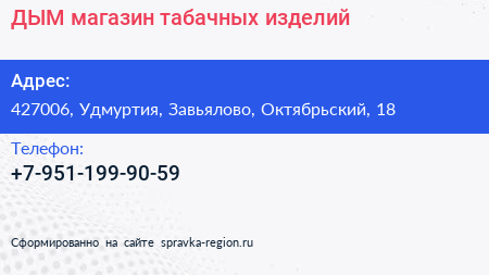 ДЫМ, магазин табачных изделий по адресу 427006, Удмуртия, Завьялово, Октябрьский, 18 в дальнейшем Организация, размещена в следующих категориях: