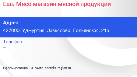 Ешь Мясо, магазин мясной продукции по адресу 427000, Удмуртия, Завьялово, Гольянская, 21а в дальнейшем Организация, размещена в следующих категориях: