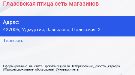 Глазовская птица, сеть магазинов по адресу 427006, Удмуртия, Завьялово, Полесская, 2 в дальнейшем Организация, размещена в следующих категориях: