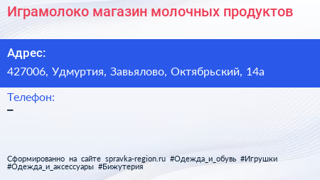 Играмолоко, магазин молочных продуктов по адресу 427006, Удмуртия, Завьялово, Октябрьский, 14а в дальнейшем Организация, размещена в следующих категориях: