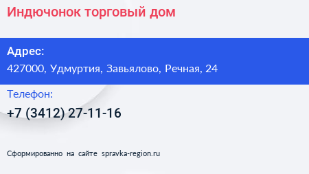 Индючонок, торговый дом по адресу 427000, Удмуртия, Завьялово, Речная, 24 в дальнейшем Организация, размещена в следующих категориях: