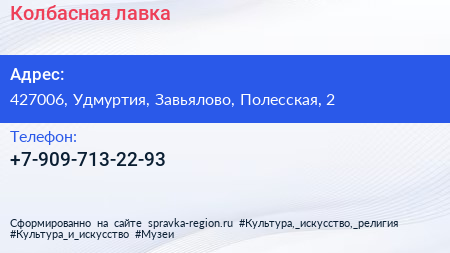 Колбасная лавка по адресу 427006, Удмуртия, Завьялово, Полесская, 2 в дальнейшем Организация, размещена в следующих категориях: