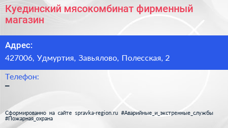 Куединский мясокомбинат, фирменный магазин по адресу 427006, Удмуртия, Завьялово, Полесская, 2 в дальнейшем Организация, размещена в следующих категориях: