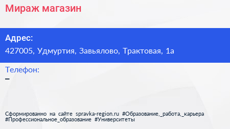 Мираж, магазин по адресу 427005, Удмуртия, Завьялово, Трактовая, 1а в дальнейшем Организация, размещена в следующих категориях: