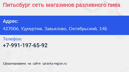 Питьсбург, сеть магазинов разливного пива по адресу 427006, Удмуртия, Завьялово, Октябрьский, 14Б в дальнейшем Организация, размещена в следующих категориях: