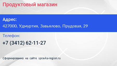 Продуктовый магазин по адресу 427000, Удмуртия, Завьялово, Прудовая, 29 в дальнейшем Организация, размещена в следующих категориях: