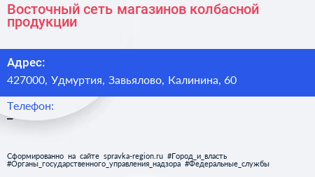 Восточный, сеть магазинов колбасной продукции по адресу 427000, Удмуртия, Завьялово, Калинина, 60 в дальнейшем Организация, размещена в следующих категориях: