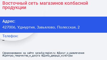 Восточный, сеть магазинов колбасной продукции по адресу 427006, Удмуртия, Завьялово, Полесская, 2 в дальнейшем Организация, размещена в следующих категориях: