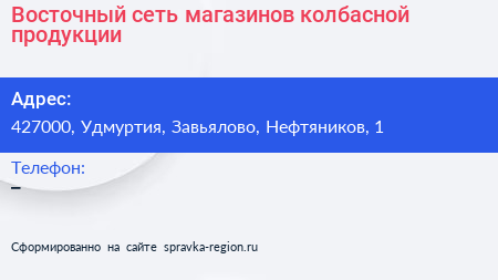 Восточный, сеть магазинов колбасной продукции по адресу 427000, Удмуртия, Завьялово, Нефтяников, 1 в дальнейшем Организация, размещена в следующих категориях: