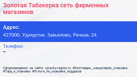 Золотая Табакерка, сеть фирменных магазинов по адресу 427000, Удмуртия, Завьялово, Речная, 24 в дальнейшем Организация, размещена в следующих категориях: