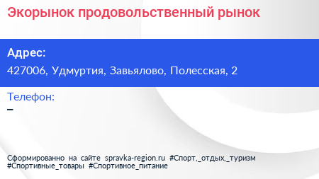Экорынок, продовольственный рынок по адресу 427006, Удмуртия, Завьялово, Полесская, 2 в дальнейшем Организация, размещена в следующих категориях: