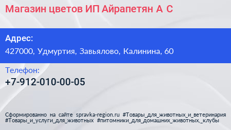 Магазин цветов, ИП Айрапетян А.С. по адресу 427000, Удмуртия, Завьялово, Калинина, 60 в дальнейшем Организация, размещена в следующих категориях: