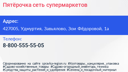 Пятёрочка, сеть супермаркетов по адресу 427005, Удмуртия, Завьялово, Зои Фёдоровой, 1а в дальнейшем Организация, размещена в следующих категориях: