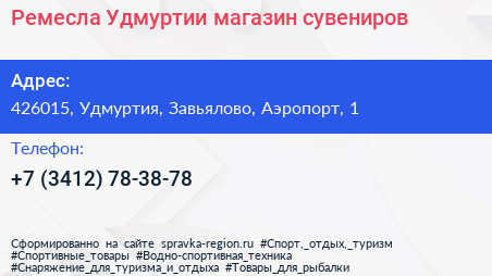 Ремесла Удмуртии, магазин сувениров по адресу 426015, Удмуртия, Завьялово, Аэропорт, 1 в дальнейшем Организация, размещена в следующих категориях: