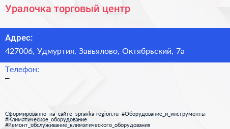 Уралочка, торговый центр по адресу 427006, Удмуртия, Завьялово, Октябрьский, 7а в дальнейшем Организация, размещена в следующих категориях: