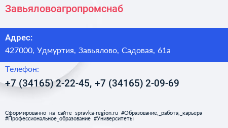 Завьяловоагропромснаб по адресу 427000, Удмуртия, Завьялово, Садовая, 61а в дальнейшем Организация, размещена в следующих категориях: