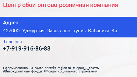 Центр обои, оптово-розничная компания по адресу 427000, Удмуртия, Завьялово, тупик Кабаниха, 4а в дальнейшем Организация, размещена в следующих категориях: