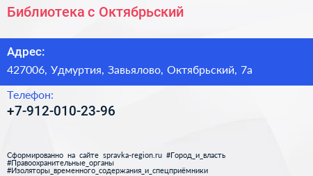 Библиотека, с. Октябрьский по адресу 427006, Удмуртия, Завьялово, Октябрьский, 7а в дальнейшем Организация, размещена в следующих категориях: