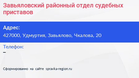 Завьяловский районный отдел судебных приставов по адресу 427000, Удмуртия, Завьялово, Чкалова, 20 в дальнейшем Организация, размещена в следующих категориях: