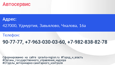 Автосервис по адресу 427000, Удмуртия, Завьялово, Чкалова, 16а в дальнейшем Организация, размещена в следующих категориях:
