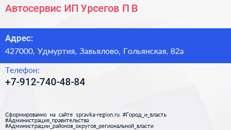 Автосервис, ИП Урсегов П.В. по адресу 427000, Удмуртия, Завьялово, Гольянская, 82а в дальнейшем Организация, размещена в следующих категориях: