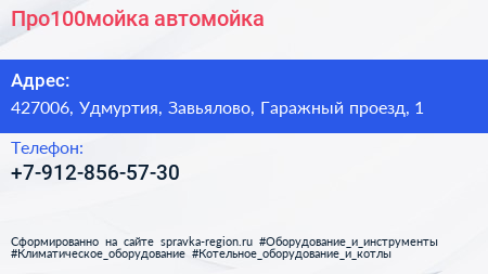 Про100мойка., автомойка по адресу 427006, Удмуртия, Завьялово, Гаражный проезд, 1 в дальнейшем Организация, размещена в следующих категориях: