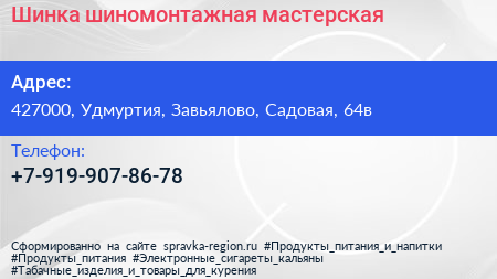 Шинка, шиномонтажная мастерская по адресу 427000, Удмуртия, Завьялово, Садовая, 64в в дальнейшем Организация, размещена в следующих категориях: