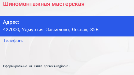 Шиномонтажная мастерская по адресу 427000, Удмуртия, Завьялово, Лесная, 35Б в дальнейшем Организация, размещена в следующих категориях: