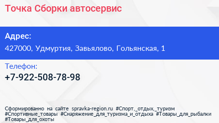 Точка Сборки, автосервис по адресу 427000, Удмуртия, Завьялово, Гольянская, 1 в дальнейшем Организация, размещена в следующих категориях: