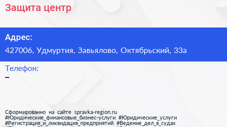 Защита, центр по адресу 427006, Удмуртия, Завьялово, Октябрьский, 33а в дальнейшем Организация, размещена в следующих категориях: