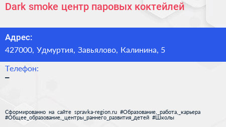 Dark smoke, центр паровых коктейлей по адресу 427000, Удмуртия, Завьялово, Калинина, 5 в дальнейшем Организация, размещена в следующих категориях: