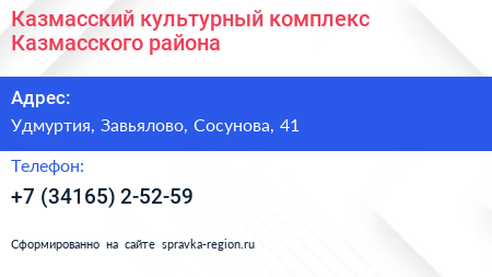 Казмасский, культурный комплекс Казмасского района по адресу Удмуртия, Завьялово, Сосунова, 41 в дальнейшем Организация, размещена в следующих категориях:
