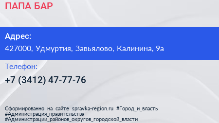 ПАПА-БАР по адресу 427000, Удмуртия, Завьялово, Калинина, 9а в дальнейшем Организация, размещена в следующих категориях: