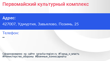 Первомайский, культурный комплекс по адресу 427007, Удмуртия, Завьялово, Позимь, 25 в дальнейшем Организация, размещена в следующих категориях: