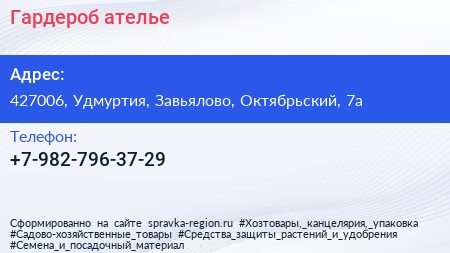 Гардероб, ателье по адресу 427006, Удмуртия, Завьялово, Октябрьский, 7а в дальнейшем Организация, размещена в следующих категориях: