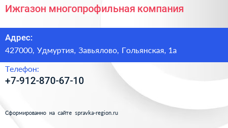 Ижгазон, многопрофильная компания по адресу 427000, Удмуртия, Завьялово, Гольянская, 1а в дальнейшем Организация, размещена в следующих категориях: