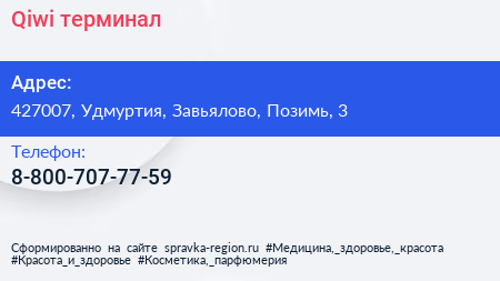 Qiwi, терминал по адресу 427007, Удмуртия, Завьялово, Позимь, 3 в дальнейшем Организация, размещена в следующих категориях: