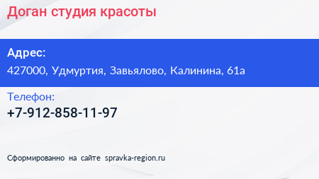 Доган, студия красоты по адресу 427000, Удмуртия, Завьялово, Калинина, 61а в дальнейшем Организация, размещена в следующих категориях: